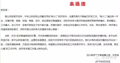 2015年四川电信电渠正处于移动化和O2O化转型发展的关键时期,此时,由安易文带领的接口项目组除了支撑电渠现有线上系统的接口开发外,还要重点支撑新项目——“店小二”的建立。由于是新建项目,安易文丝毫不敢懈怠,承担巨大压力,加班加点赶项目。凭借强硬的技术能力、良好的支撑态度以及积极主动的沟通,安易文的工作得到了客户的认可,并在8月收到客户的书面表扬。