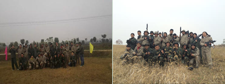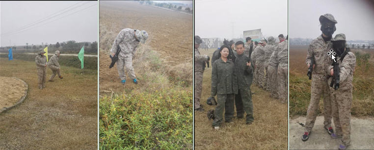 下午进行了真人CS作战,场地设在野外草场,整个“战场”环境十分逼真,大家既紧张又兴奋。经过教练一番指导后,所有人分为AB两个小组。战斗前,小组还分别“秘密”讨论并制定了战术战略。